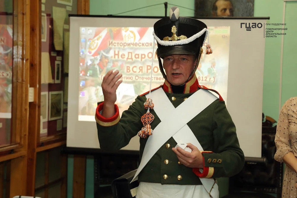 Особое внимание участников мероприятия привлек ведущий игры в образе Макария Дмитриевича Тугаринова – участника заграничных походов русской армии 1813–1814 гг., позднее – городничего Вельска. Его роль сыграл Павел Ионов, руководитель среднего кадетского класса Вельского военно-морского клуба, который предстал перед участниками презентации в форме гренадера русской армии начала XIX века.